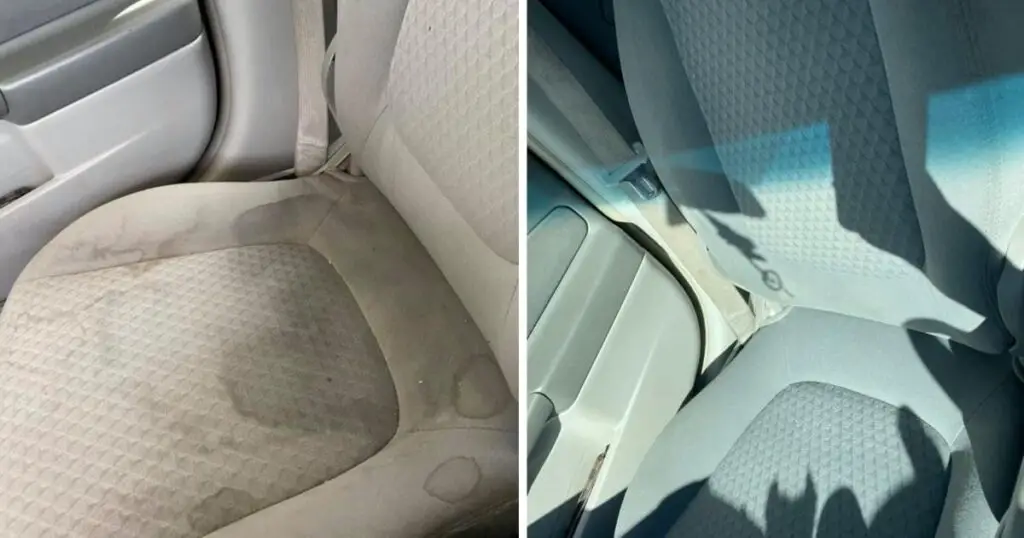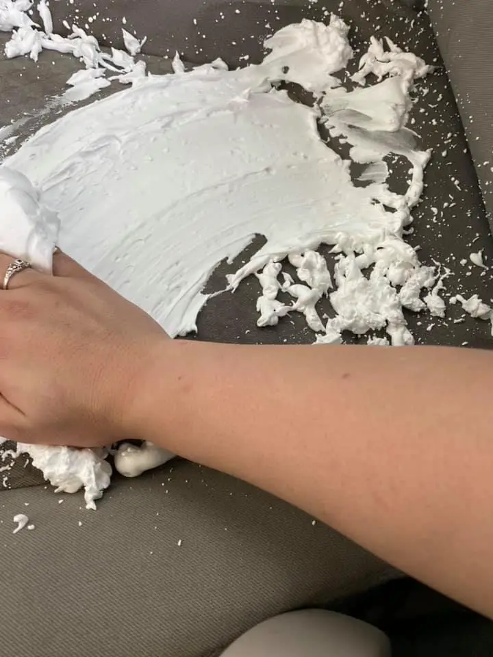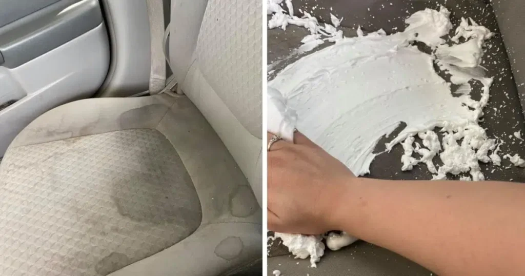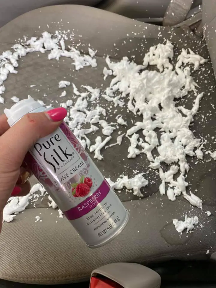 She took some scented shaving cream, rubbed it all over her car’s seats, then scrubbed them with a sponge and warm water. She then removed the filter from her vacuum, sucked up the excess water, and let the seats air dry.