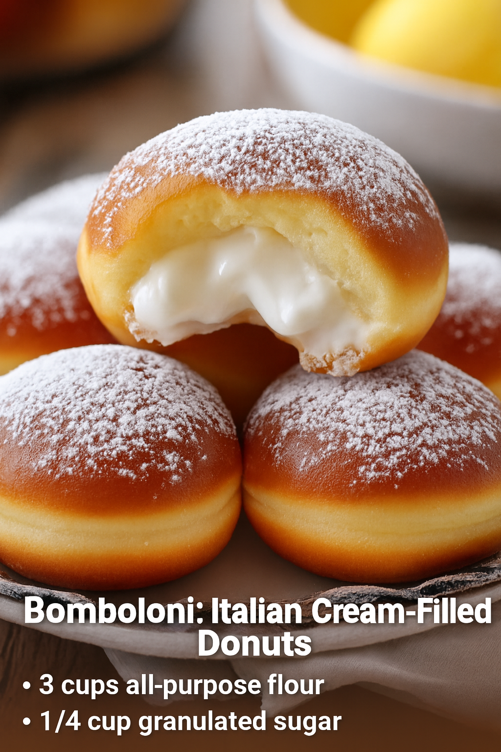 When preparing the Pastry Cream, the crucial step of tempering the eggs must be executed slowly and deliberately; this involves gradually whisking the hot milk into the egg yolk mixture to gently raise their temperature, preventing the yolks from scrambling and ensuring a perfectly smooth base for the custard. During the frying process, the most significant factor is maintaining the oil temperature consistently at 350^\circ\text{F} (175^\circ\text{C}), requiring a deep-fry thermometer and constant monitoring, because oil that is too cool will result in greasy, soggy donuts that absorb excess fat, while oil that is too hot will burn the exterior before the center is fully cooked. A final, often-missed tip is to dust the Bomboloni immediately upon removing them from the oil while they are still hot and slightly tacky, ensuring the sugar coating adheres perfectly and creating the essential sweet crust that contrasts beautifully with the soft interior.