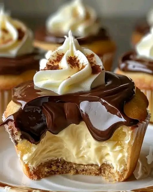 Picture a tray of glossy cupcakes, each topped with rich chocolate that glistens under the light. Guests bite into the soft cake, surprised by the creamy vanilla center. It’s a dessert that feels nostalgic yet modern, indulgent yet approachable — a true crowd‑pleaser.