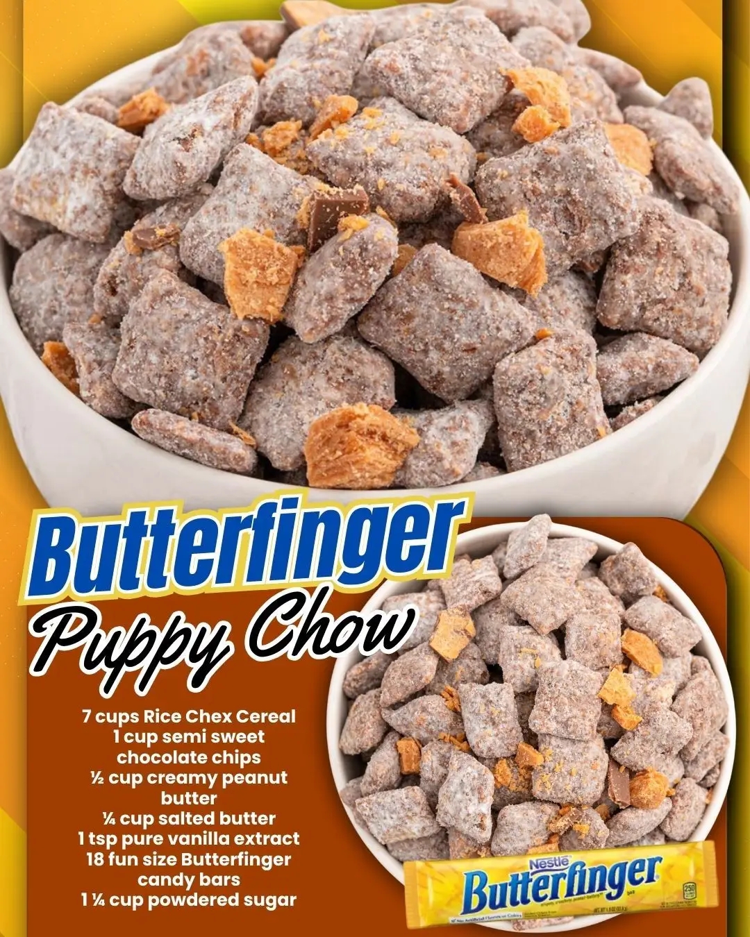 This Butterfinger Puppy Chow is a sweet, crunchy, no-bake treat that’s as fun to make as it is to eat. With its irresistible mix of chocolate, peanut butter, and candy bar crunch, it’s sure to become a favorite for parties, holidays, or anytime snacking. Keep a batch on hand—you never know when the craving will strike.
