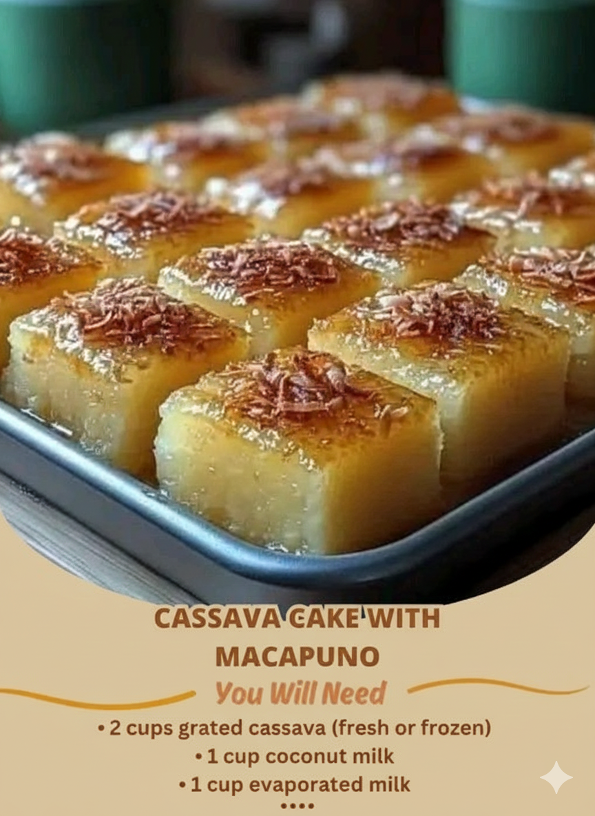 Cassava Cake with Macapuno is one of those treasured Filipino desserts that carries the warmth of family gatherings, the soft hum of shared stories, and the comforting richness of ingredients rooted deeply in tradition. It is a dish that has traveled from humble home kitchens to festive banquet tables, becoming a symbol of hospitality and celebration. This particular version, enriched with macapuno, offers a delightful twist on the classic cassava cake, giving it a luxurious texture and sweetness that turns every slice into a moment worth savoring. What makes cassava cake special is its remarkable ability to feel both rustic and elegant at the same time. Cassava, also known as yucca or manioc, is a staple root crop commonly used throughout Southeast Asia and many other regions of the world. When grated and combined with coconut milk, condensed milk, and eggs, it transforms into a tender, custard-like dessert with a subtly chewy texture and deeply comforting flavor. Adding macapuno—a soft, gelatinous coconut variety—introduces a silky richness that pairs beautifully with the cassava base. The result is a dessert that feels nostalgic yet elevated, simple yet indulgent, and endlessly customizable to different tastes or occasions. This extended guide is designed to offer not just a recipe but an immersive, informative culinary experience. Whether you are making cassava cake for the first time or revisiting a beloved family tradition, the detailed instructions, tips, and insights below will ensure that your cassava cake turns out perfectly every time. Each step has been thoughtfully explained so that even beginner bakers can confidently create a dessert that looks stunning, tastes exceptional, and carries the comforting spirit of Filipino home cooking. Before diving into the recipe, it is worth appreciating the functional beauty of the ingredients involved. Cassava provides structure, firmness, and a faint earthy sweetness. Coconut milk contributes richness and aroma. Condensed milk and sugar offer sweetness while also helping the cake set into its signature creamy texture. Evaporated milk gives body and depth. Butter adds flavor and tenderness. Eggs bind everything together, ensuring a smooth, cohesive bake. When these ingredients come together, each plays a vital role in creating the harmonious, delightful dessert we know as cassava cake. The inclusion of macapuno elevates this harmony to another level. Macapuno has a texture unlike regular coconut; it is soft, stretchy, and decadent without being heavy. When folded into cassava cake batter, macapuno adds smoothness and a special kind of melt-in-the-mouth effect that makes each bite memorable. Many modern versions of the recipe include macapuno because it adds a luxurious touch without complicating the preparation. Whether it is served during holidays, parties, potlucks, or even casual afternoon merienda, cassava cake remains a dependable crowd-pleaser.