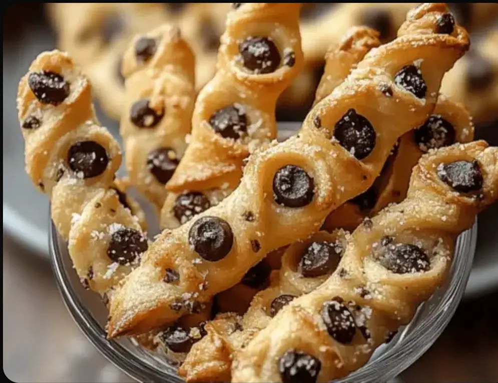 Chocolate Chip Cookie Dough Twists are visually stunning: golden spirals with glistening chocolate chips peeking through flaky layers. The aroma of baking butter and vanilla fills the kitchen, promising sweetness.