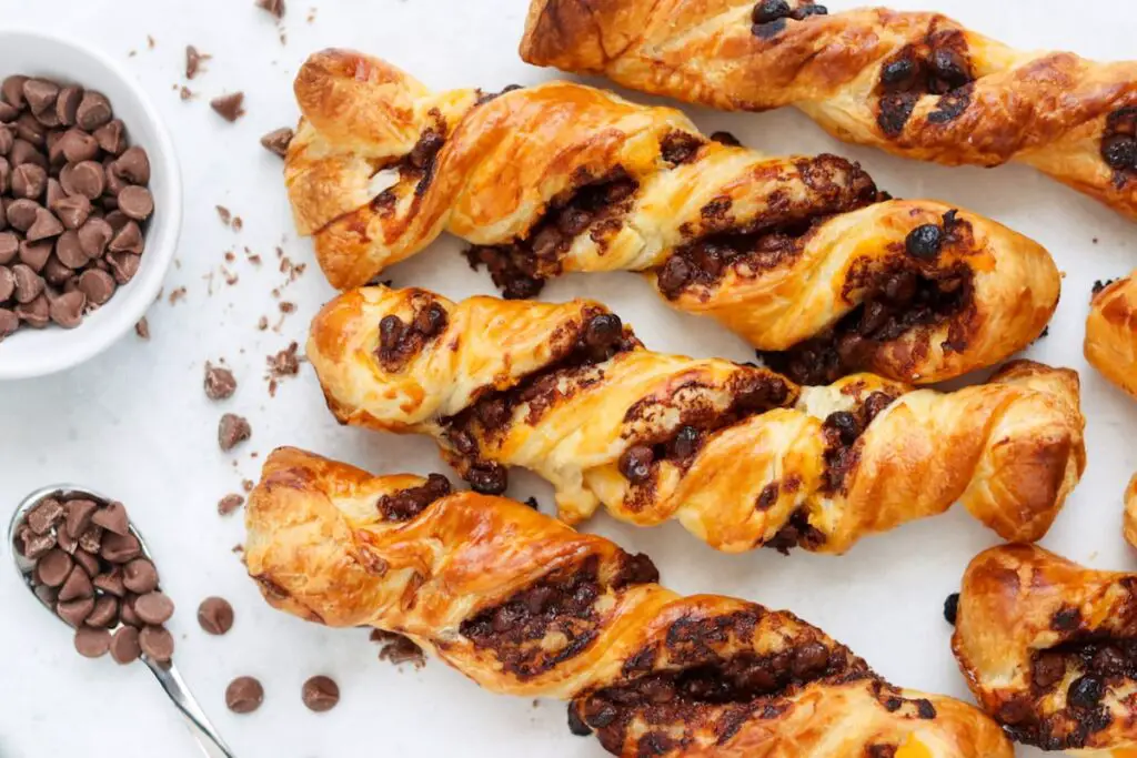 Puff pastry, or pâte feuilletée, dates to 17th-century France, perfected for its hundreds of buttery layers that puff dramatically when baked. Traditional chocolate twists in France and the UK use pastry cream and chips, evoking coffee shop favorites like those from Costa. The cookie dough variation appears in contemporary recipes, likely inspired by edible cookie dough trends and the desire for raw dough flavors without eggs.