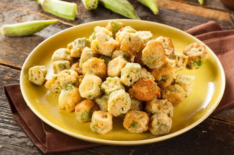 - Heat enough oil for deep frying to medium-high heat or until a thermometer reads 350˚F. Fry in small batches, removing okra from oil when the outer color is golden brown (about 2 minutes each side.