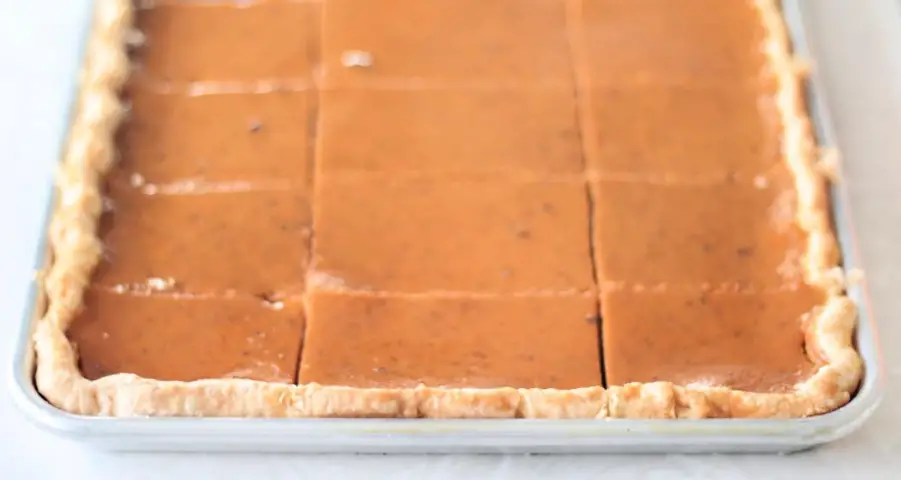 Remove the slab pie from the oven and allow it to cool completely on a wire rack. Once cooled, slice into neat, generous squares using a sharp knife. Each piece reveals a velvety pumpkin layer on a crisp, buttery base — a perfect combination of textures.