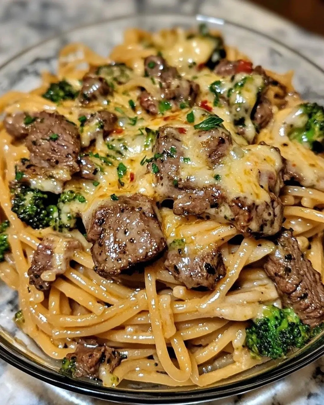 Tender steak bites, crisp-tender baby broccoli, and spaghetti tossed in a velvety garlic-Parmesan Alfredo sauce—this skillet pasta is pure comfort food with a gourmet twist.