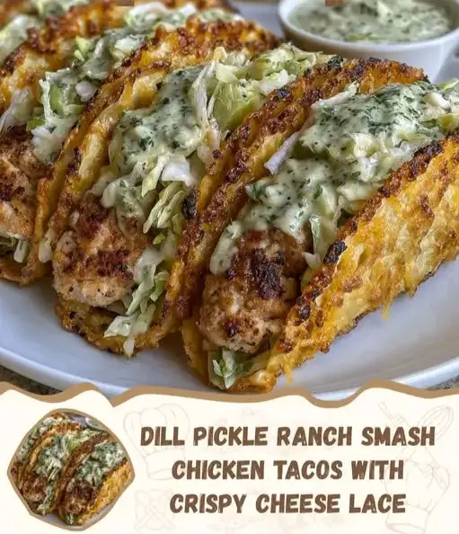 These Dill Pickle Ranch Smash Chicken Tacos are the ultimate fusion of comfort food and bold flavor. With crispy cheese lace, juicy chicken, and a tangy ranch drizzle, they’re guaranteed to be a hit at your next gathering—or just a fun twist on taco night. Serve with extra napkins and enjoy every crunchy, creamy bite.