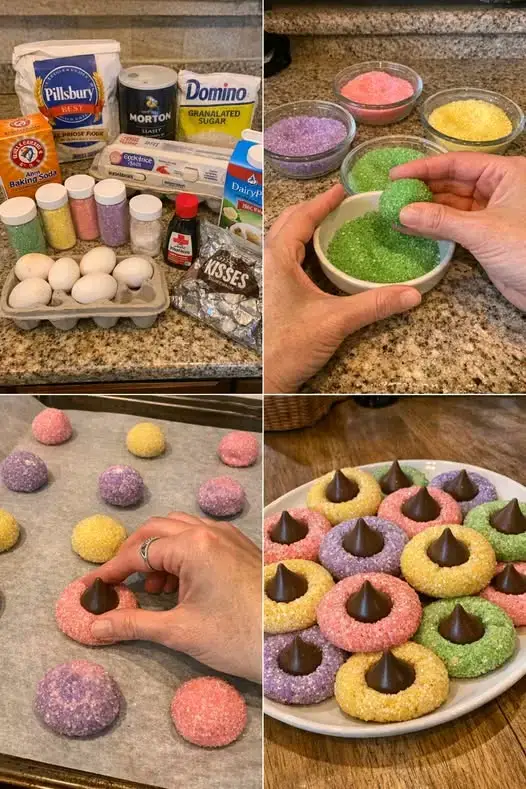 These Easter Blossom Cookies are festive, fun, and delicious. With their pastel sparkle and chocolate kiss centers, they’re the perfect addition to any Easter celebration.