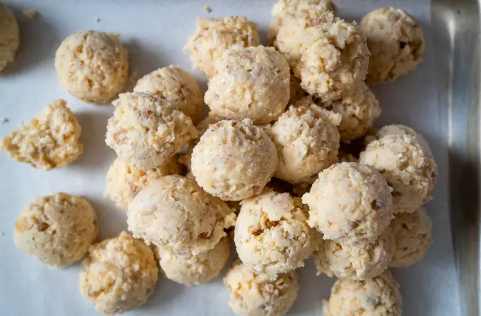 Using a small cookie scoop, portion out bite-sized mounds onto the prepared baking sheet.