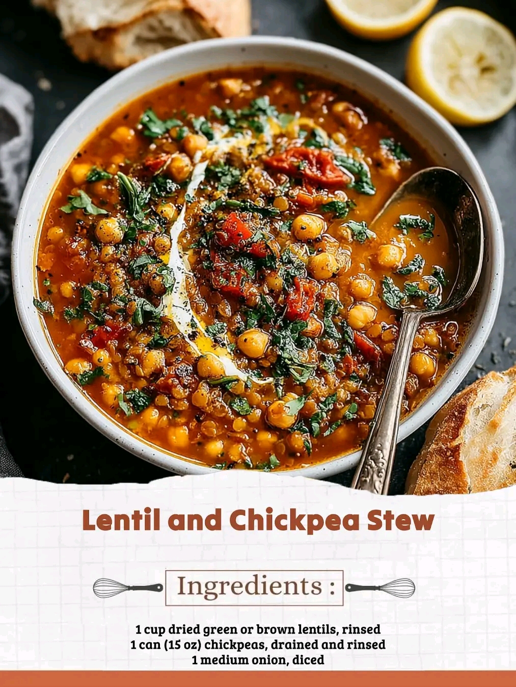 This Lentil and Chickpea Stew is a hearty, plant‑based dish that’s perfect for cozy nights or healthy meal prep. Lentils bring creaminess, chickpeas add texture, and aromatic spices make every spoonful rich and satisfying. It’s budget‑friendly, protein‑packed, and naturally vegan.