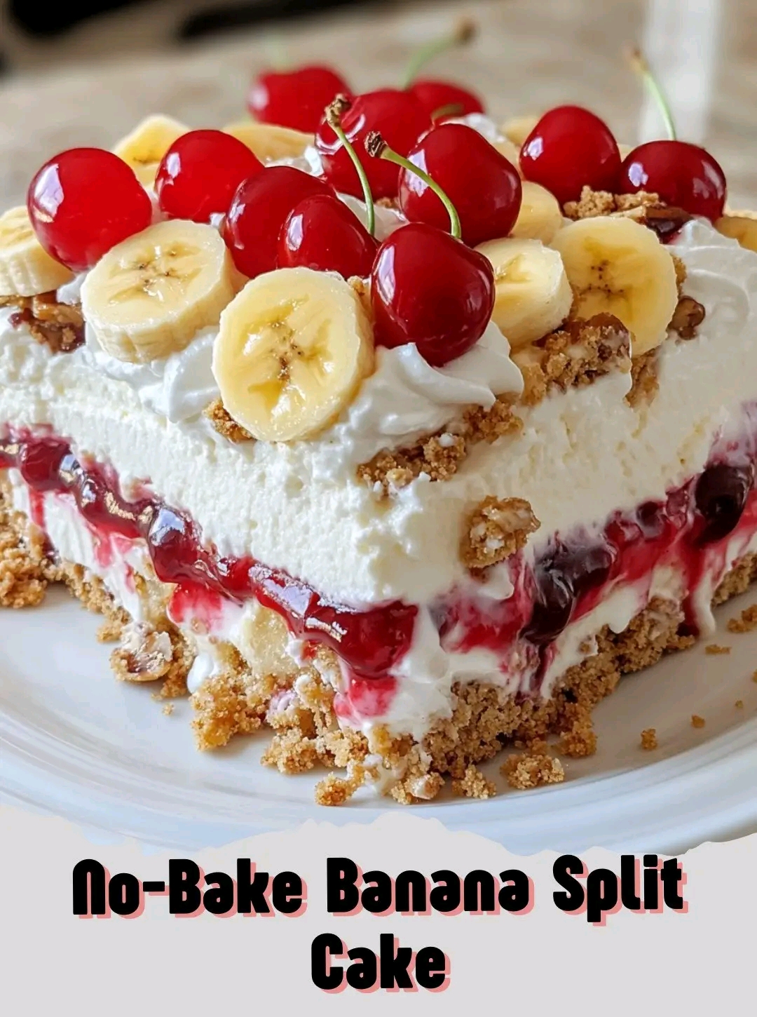 Imagine lifting the lid off a chilled pan of this dessert — the layers glisten with cherries, pineapple, and chocolate drizzle. Each slice is creamy, fruity, and crunchy, capturing the joy of a banana split in cake form. It’s the kind of dessert that makes people smile before they even take a bite.