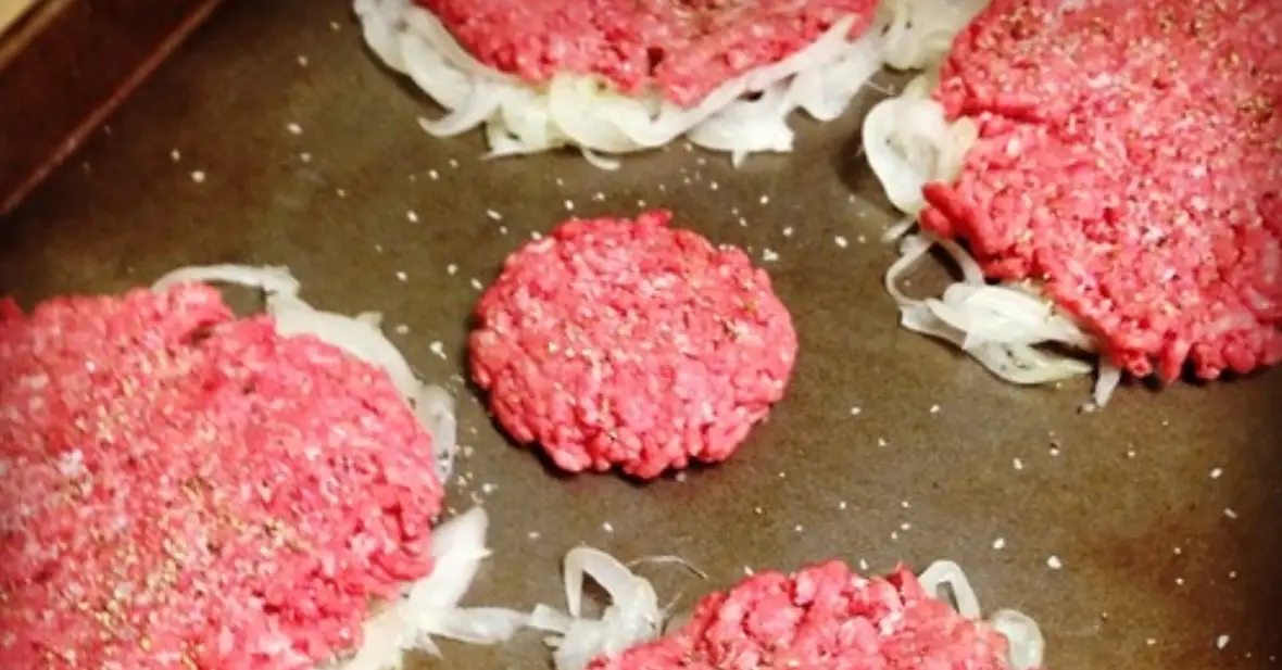 Divide the drained onions into four piles on a rimmed baking sheet. (You don’t want to press them too compact.) Form the ground beef into 4 loose balls. Lay these beef ball on top of the onion mounds and firmly press down (using your palm) the beef onto the onions. The patties should be 4 inches in diameter when finished. Salt and pepper the beef generously.