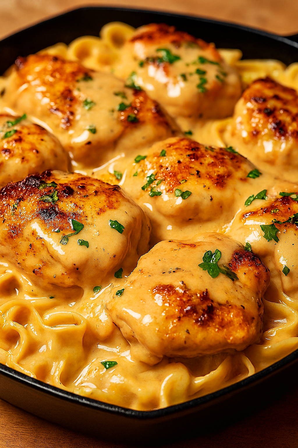 Imagine coming home after a long day, the kind where your feet hurt, your inbox is overflowing, and the last thing you want to do is spend hours in the kitchen juggling multiple pots and pans. Now picture this: in just one skillet, you sear juicy chicken breasts to golden perfection, then transform the same pan into a bubbling cauldron of creamy, garlicky sauce that cooks tender egg noodles right in it. A pat of butter melts in, Parmesan cheese swirls through for that nutty richness, and suddenly dinner is ready—tender chicken nestled atop a bed of the most luxurious buttered noodles you’ve ever tasted. This One-Pan Chicken with Creamy Buttered Noodles is that dream made reality. It’s hassle-free, flavor-packed, and delivers restaurant-quality comfort food with minimal effort and even less cleanup. Perfect for busy families, solo diners who deserve a treat, or anyone craving something warm and satisfying without the fuss. With just a handful of pantry staples and about 35 minutes, you’ll have a meal that feels like a hug on a plate. The creamy sauce clings to every noodle, the chicken stays moist and flavorful, and the whole dish comes together in perfect harmony. Whether it’s a chilly Tuesday night or a lazy weekend, this recipe will quickly climb to the top of your rotation.