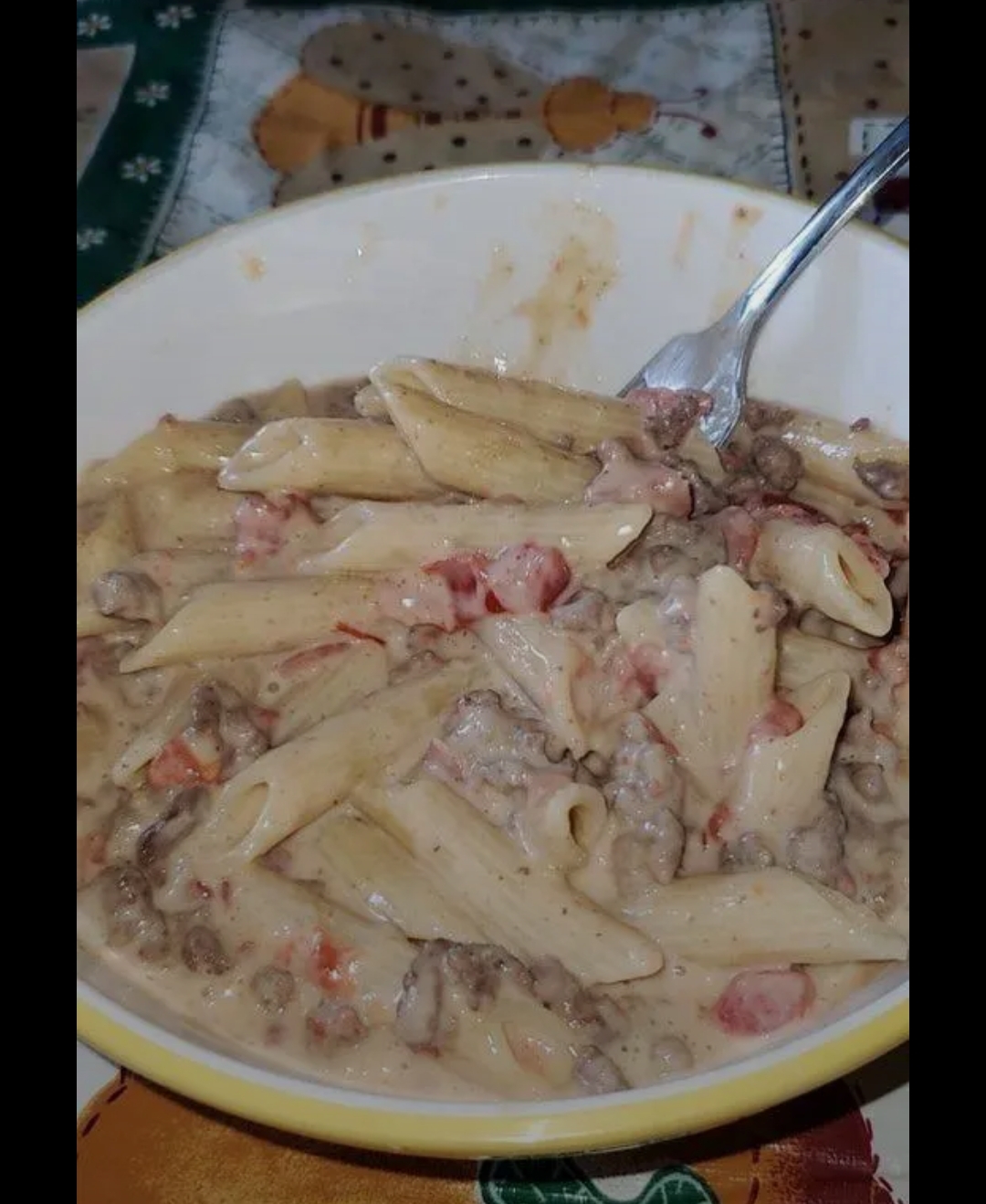 A creamy pasta dish loaded with seasoned beef, Velveeta, and Rotel tomatoes.