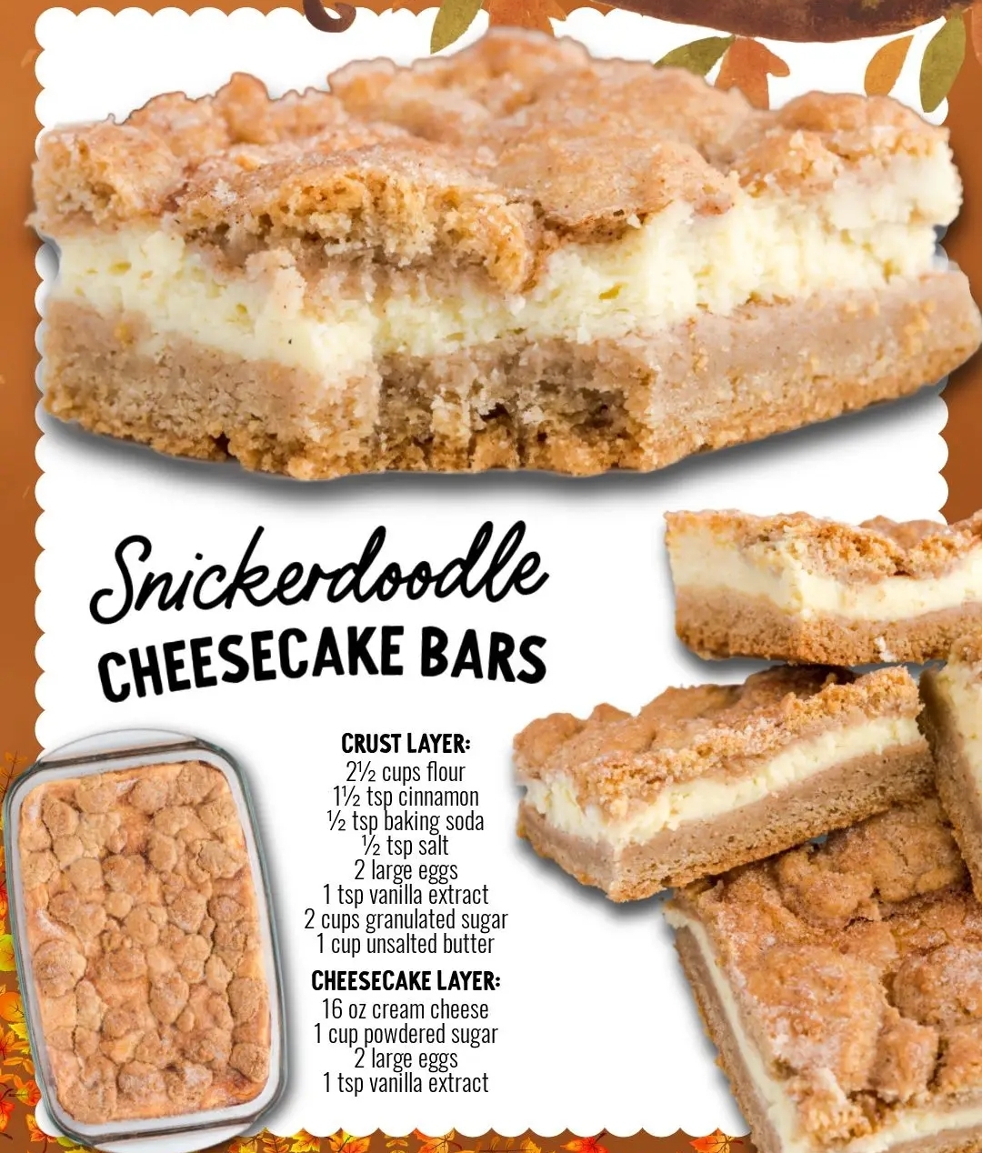 There’s something magical about fall baking. The air is crisp, the leaves are golden, and the kitchen fills with the warm aroma of cinnamon and sugar. These Snickerdoodle Cheesecake Bars combine two beloved desserts into one irresistible treat: the soft, spiced comfort of snickerdoodles and the rich creaminess of cheesecake.