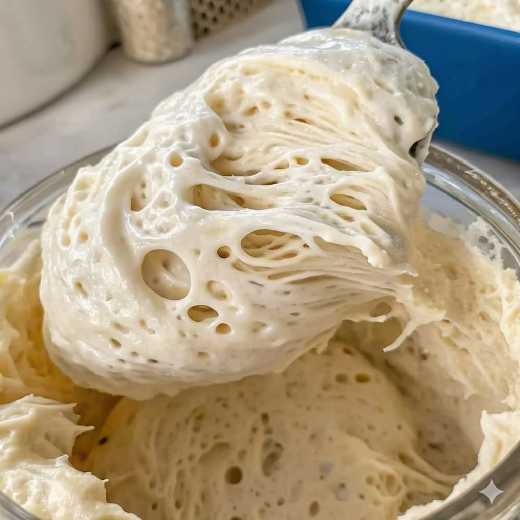 A mature sourdough starter is a living, dynamic culture: creamy beige, dotted with bubbles of varying sizes, and exuding a tangy, yogurt-like aroma with hints of fruit or beer. When stirred, it reveals a stretchy, gluten-developed web full of air pockets, resembling melted cheese pulled apart.