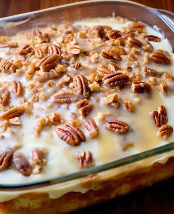 The sweetened condensed milk praline topping transforms a simple cake into a luxurious treat. Every bite is a blend of buttery richness and nutty sweetness—an irresistible Southern combination.