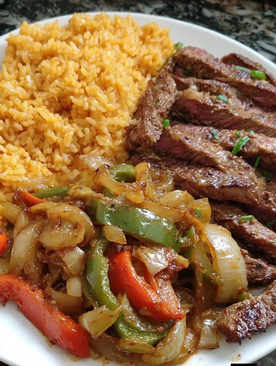 Juicy marinated steak, sizzling peppers and onions, and fluffy yellow rice — a colorful, smoky, and satisfying meal.