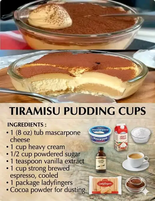 These Tiramisu Pudding Cups are a playful twist on the classic Italian dessert. With creamy mascarpone pudding, coffee‑soaked ladyfingers, and a dusting of cocoa, they’re elegant yet easy to serve in individual portions — perfect for parties or a make‑ahead treat.