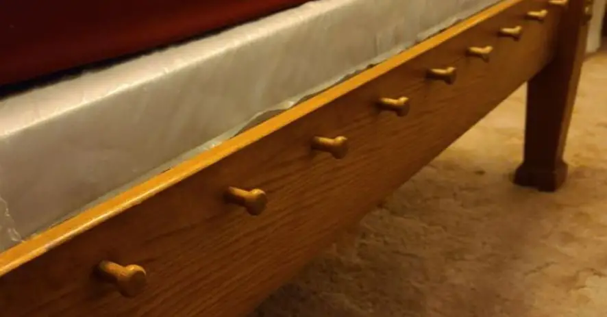 Ropes, however, do not continue to stay tight. In a few nights, or with a kid hopping on, you’d have a hammock situation. And so, people used these wooden pegs as part of like tightening the ropes. Pegs would slip into holes in the bed frame, and you’d crank things back into position, and everything was once again firm.
