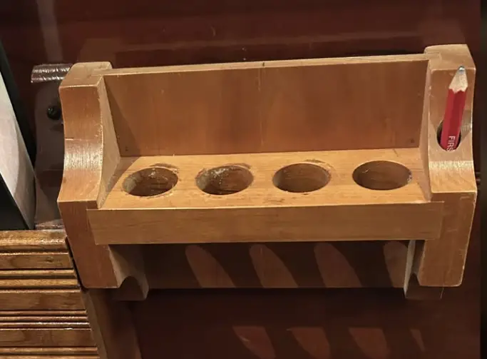 The pencil and shelf had a purpose. Underneath the holes was an area your church wanted you to utilize such as offering envelopes, visitor slips, or prayer slips. It held whatever your church wanted. The pencil compartment and small pencil (red or black) that was present were similar to a golf pencil.