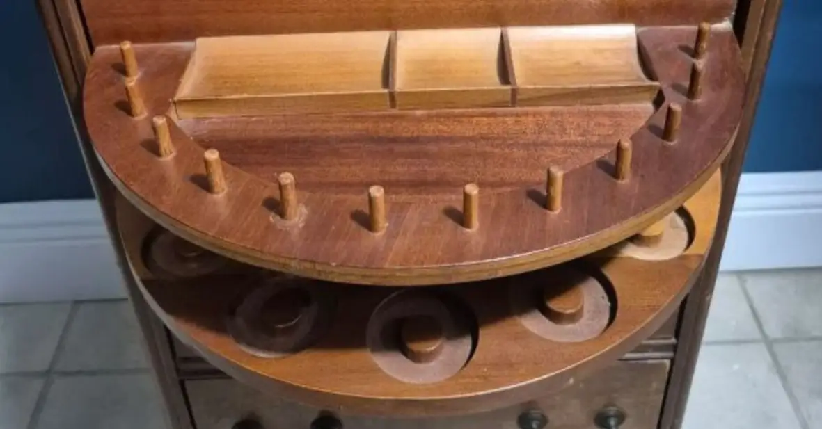 Revolving shelves that have wood pegs for thread spools — because, like, I mean what, let’s even just be real, which it is so good and right that have ev-ery-thing is stand up in same row like this. It’s all thanks to the design of the vintage sewing cabinet.