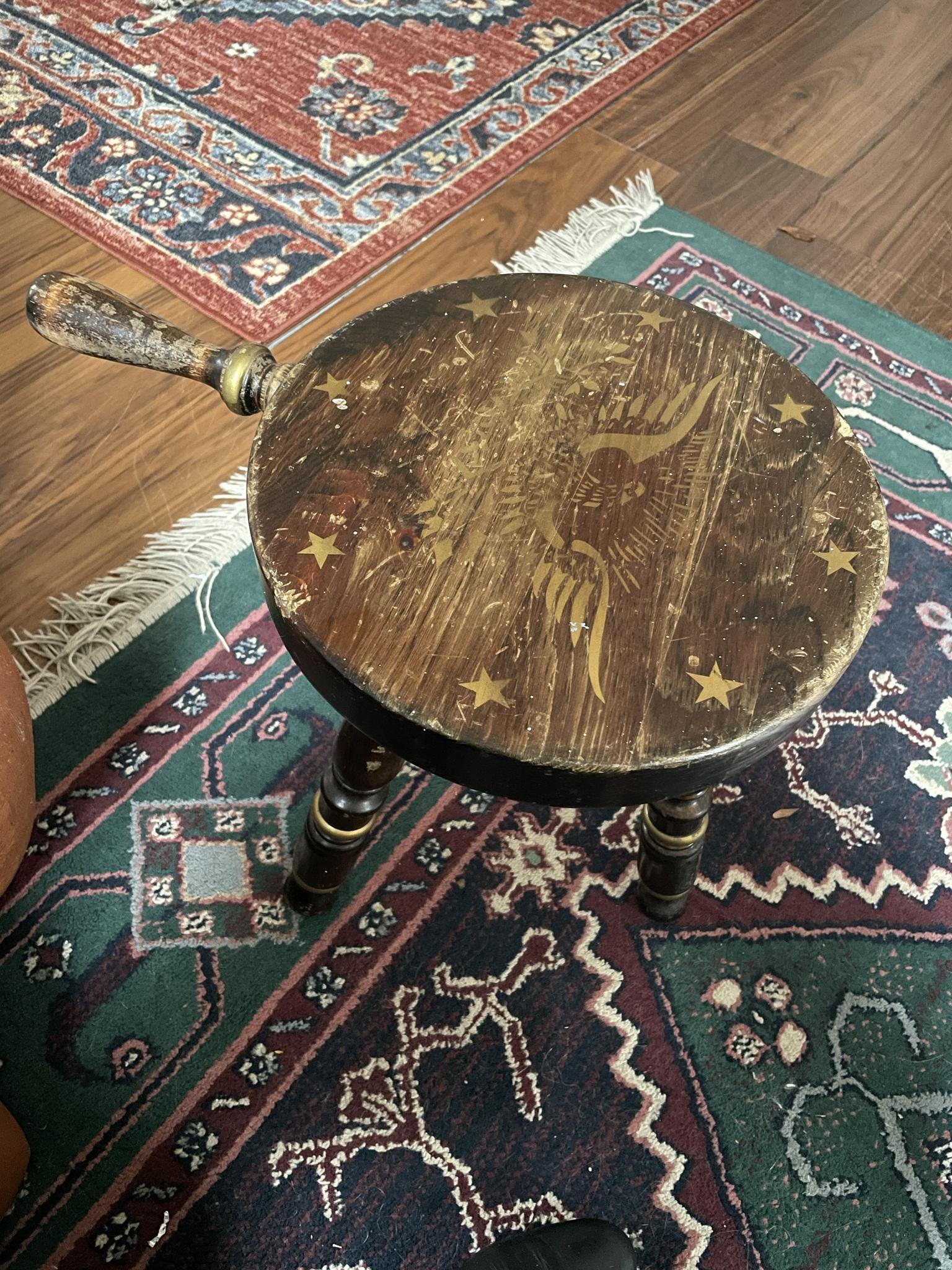 There I was, wandering the thrift store, fully intending to avoid buying anything. And then there it lay—a milking stool with handle. Worn wood, scuffed legs, and that curious little peg sticking out the side. One leg had the same sort of carved rings I remembered from the old porch columns. The handle, I noticed, had a hole in it. It was probably used for hanging on a barn wall or hooking on a belt loop.